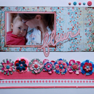 Depuis vendredi soir je suis malade... Je pense bien que j'ai la grippe; j'ai mal partout comme si j'avais courru le marathon et je fais de la fièvre. La nuit passé j'ai tellement mal dormi, j'ai dû me réveriller 20 fois en sueur... Hier, c'était le party de fête de ma belle-soeur et malheureusement je ne me sentais vraiment assez en forme pour y aller, donc je suis resté toute seule ici... j'ai donc fait deux pages. La première est pour le défi rose et bleu sur Scrapbook Café et l'autre est pour un défi Bobarbo, je devais faire au moins trois fleurs avec 4 éléments. J'aime beaucoup le résultat de mes deux pages.