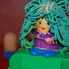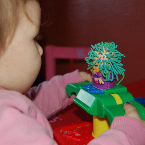 Quand j'ai vue ce jouet, je n'ai pas pu résiter!! J'en avais un pareil quand j'étais petite et j'ai tellement aimé jouer avec!! Ma fille aussi adoooooooore!! Elle veut toujours faire pousser les cheveux des bonhommes!! Elle est trop mignonne!