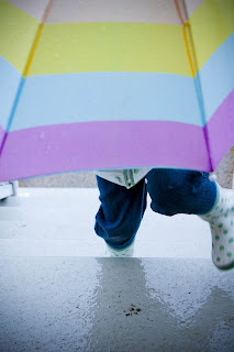 Il fait tellement beau, le soleil est chaud!!Voici une petite photo de ma puce mardi dernier avec son attirail contre la pluie!